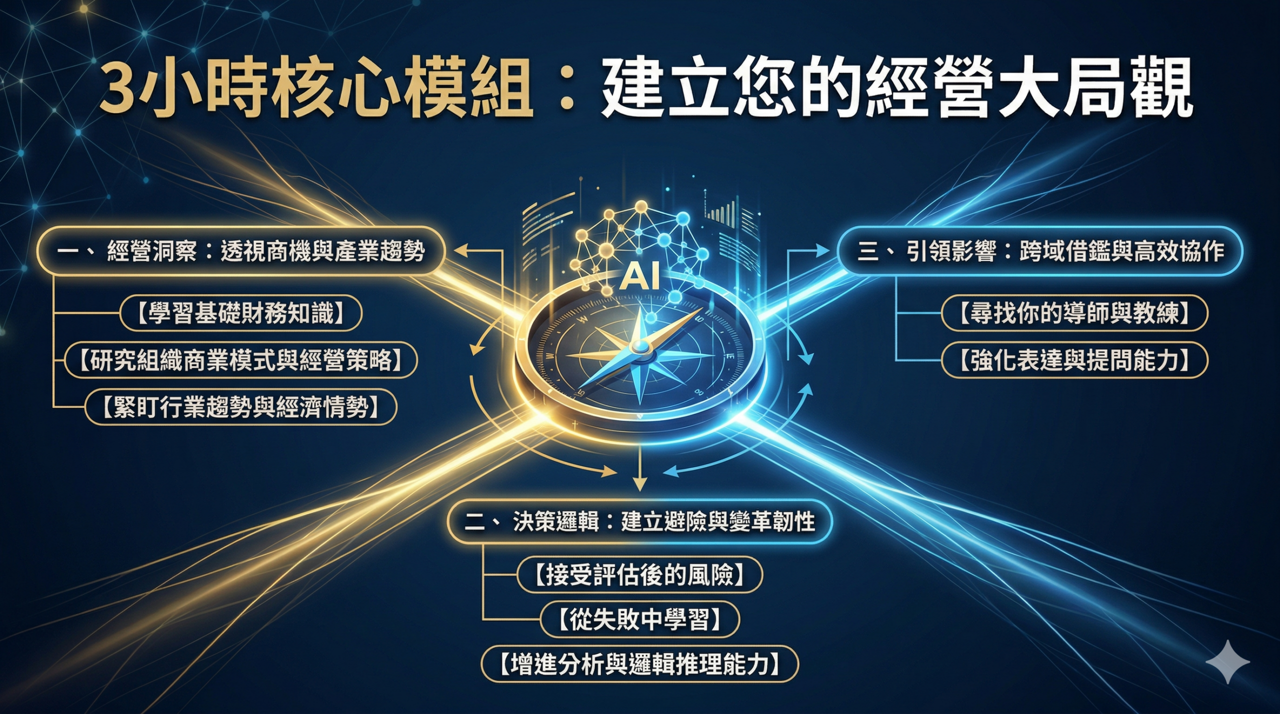 ATI精選課程|AI 時代領袖特訓商業敏銳度:建構決策者的宏觀經營戰略立即預約ATI精選課程 | 3 小時體驗研習AI 讓執行更快,商業敏銳度讓決策更準。這不是再多上一堂管理課,也不是把策略名詞再講一遍。這堂體驗研習真正要做的,是協助企業主與核心主管,把視角從部門執行,往上拉到資源配置、風險判斷與經營節奏,讓每一次決策更有商業依據。ATI精選課程一直在做的,不只是把知識講清楚,而是把主管真正需要的判斷能力,對齊企業現場的帶領力、推進力與經營視野。3 小時體驗研習3 大策略模組8 大實戰構面決策者專屬設計立即預約|升級經營視角先看課程內容對象不是全員訓練,而是正在承擔資源配置、跨部門協作與經營判斷責任的人。ATI 的做法我們不是只把知識講清楚,而是把主管真正需要的判斷能力,拉回經營現場。ATI在首頁一直強調的,不只是「懂策略」,而是把變革、組織能力、分析判斷與創新思維,做成企業可導入、可推進、可落地的能力結構。帶得回去不是零碎工具,而是能回到現場使用的經營判斷框架。看得更遠把財務、商模、風險與決策拉到更完整的經營視角。做得到從「知識理解」走向「判斷更準、推進更穩、帶動更到位」。課程價值AI [...]